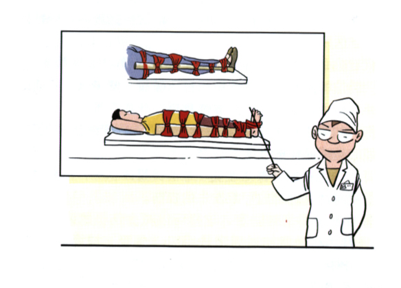 以上这些方法只能用于急救。采取这些措施后,应把伤者及早送到医院作进一步处理。 现代社会的创伤,常常是多处、多发损伤。如果骨折时,覆盖骨头部位的皮肤和皮肤软组织损伤裂破,使得骨头折断的一端与外界相通,这就称为开放性骨折。开放性骨折是一种常见的外伤。如果急救措施不当,会给日后的治疗带来很多困难,甚至可能会造成肢体的残疾。 对开放性骨折的急救处理要注意伤员整体状况,不能只顾局部而忽视身体其他部位可能发生损伤。 对骨折部位要临时固定,这样可以减少伤员的痛苦,防止骨折端因活动而增加对周围软组织、血管、神经的损伤。用夹板固定时,夹板的长度应超过骨折部位上、下两个关节。在没有固定之前,不要随意搬动伤员或者移动受伤的肢体,如果当时难以找到适当的固定物,可利用躯干或者对侧肢体来固定。 经过上述必要的处理后,要及时将伤员转到医院治疗。转送要迅速、安全、舒适,途中要注意伤员全身情况的变化。 搬运脊柱损伤的伤员时需要特别小心。对脊柱损伤的伤员,一定要让他的脊柱保持平直,千万不能用把他抬起来或背起来。一人抬肩、一人抬腿的搬运方法,用绳索、帆布等软担架搬运的方法,都是很危险的,这样会使脊柱弯曲,加重伤情,容易造成截瘫。 在搬运脊柱伤员时,最好有三个或四个人,三个人并肩站立在伤员身体的一侧,双手分别托住伤员的肩部、臀部和和大腿。一个人站在伤员的头侧用双手固定其头部,几个人动作协调一致把伤员搬放脊柱板上(或硬质担架、门板、床板上),用固定带或布带将伤员的头、胸、腰、臀、大腿、小腿、足部固定在脊柱板上(或硬质担架、门板、床板上),再转送医院。