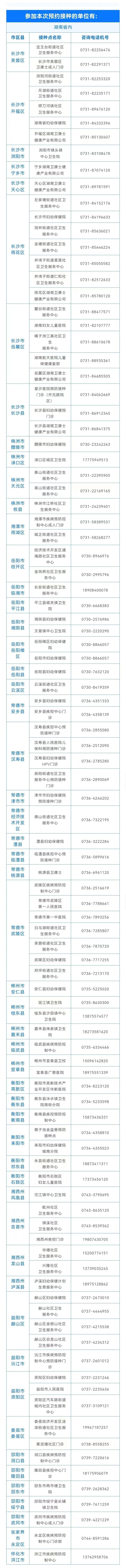 尊敬的市民朋友: 现预约接种人乳头瘤病毒(HPV)疫苗,四价HPV、九价HPV疫苗实行网上预约。本次计划预约四价人乳头瘤病毒(HPV)疫苗44605人,九价人乳头瘤病毒(HPV)疫苗4332人,在湖南省98个接种单位进行接种。为方便市民朋友了解疫苗接种相关事宜,现将有关事项公告如下: 一、本次疫苗接种全部实行网络预约,不接受电话和现场预约。市民可通过微信公众号(湖南疾控-便民信息-HPV疫苗预约-HPV疫苗-接种单位-选择四价)预约。开通在线预约时间:2023年2月13日10:00-2023年2月13日17:00,约完为止。预约后,可在小程序中我的预约记录查询预约是否成功;同时,名单于接种日也在接种单位进行公示,敬请关注。 二、首针预约成功,其余二、三针次不再预约,只需按工作人员排好的接种程序进行接种。 三、数量有限,约完即止。预约成功者请在预约接种日,持本人有效身份证和预约成功的手机到预约成功的接种单位接种疫苗;接种名额仅限本人使用,不得转让;未按时来接种者视为自愿放弃。预约成功后不能随意取消,如遇特殊原因需取消预约,请于一周内致电取消预约号码。 四、接种对象及程序:HPV四价疫苗和HPV九价疫苗适用人群为9-45岁女性。推荐0、2和6月分别接种1剂次,共计3剂; 首剂与第2剂接种间隔至少1个月,第2剂与第3剂接种间隔至少3个月,3剂应在1年内完成。 五、接种禁忌症:对酿酒酵母和疫苗成分过敏者不能接种;发热、严重器质性疾病、严重过敏体质和三个月内使用免疫球蛋白或血液制品者不宜接种;妊娠期、哺乳期妇女不宜接种本疫苗;备孕期妇女不建议接种。 六、其他事宜: (1)外地户口在湖南学习或工作者可以参与预约,其余人员建议在当地解决接种;预约成功者请在规定的预约接种日,持本人身份证原件和原始预约信息(非湖南省内身份证号还需提供在本地工作、生活或学习的相关证明),前往预约接种单位缴费及进行疫苗接种,不接受截屏、视频、拍照等方式查看预约记录,无法现场提供预约手机让工作人员核验预约记录的将不予以接种。请不要相信网上任何的缴费链接,缴费后请索取正规发票,谨防电信诈骗。 (2)宫颈癌疾病的预防,除了接种HPV疫苗外,定期宫颈筛查必不可少; (3)本次接种的四价HPV疫苗和九价HPV疫苗,数量有限,生产企业后续将会逐批供应,请大家耐心等待。
