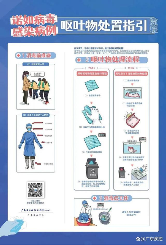 如何预防? 湖南疾控专家介绍,诺如病毒是一种可以引起急性肠胃炎的RNA病毒。 诺如病毒具有高度传染性和快速传播能力,极易在学校、托幼机构、医院等人群密集场所短时间内造成多人集中发病。 诺如病毒有以下四大特点: 诺如病毒的感染性极强,只要少量病毒颗粒,就可以感染很多人。因此,在学校、托幼机构等人群聚集场所容易出现诺如病毒感染聚集性疫情。 吃东西能感染:食用了被诺如病毒污染的食物。 喝水能感染:饮用了被诺如病毒污染的水。 接触/气溶胶能感染:接触患者排泄物或者呕吐物产生的气溶胶,或间接接触了被呕吐物或排泄物污染的物品、环境等,就有机会被诺如病毒感染。 诺如病毒具有全人群普遍易感的特点,各年龄段的人群都可能会感染。 0℃‐60℃的温度范围内可存活,普通热水无法烫死诺如病毒。 75%酒精、免洗洗手液无法灭活诺如病毒。 可在物体表面存活2周,在水中存活2个月以上。 (图片来源于中国疾病预防控制中心官方账号) 主要引起急性胃肠炎,表现为呕吐、腹泻、恶心、腹痛、头痛、发热、畏寒和肌肉酸痛等,其中儿童以呕吐为主,成人以腹泻居多。诺如病毒感染病例多为轻症,病程短,通常1-3天症状有所好转,但少数病例仍会发展成重症,研究表明重症或死亡病例通常发生于高龄老人和低龄儿童。 图片源于网络 倒入足量的5000 mg/L~10000mg/L的含氯消毒液,作用30min以上再排水。清洁时使用的拖把、抹布等工具,盛放污染物的容器都应使用含有效氯5000mg/L消毒剂溶液浸泡消毒30min后彻底冲洗,才可再次使用。 如厕后、饭前饭后、制作食物前均需清洁手部,按照7步洗手法用肥皂和流动水冲洗双手20秒以上。划重点:酒精和免洗手消毒液对诺如病毒无效,不可代替洗手。 不喝生水,蔬菜水果食用前应使用清洁水源彻底洗净,处理食材应保证生熟分开,烹饪时保证食物彻底煮熟煮透,尤其是贝类等海鲜类食品,吃不完的剩菜剩饭记得分类冷藏,重新食用前应彻底加热。做好餐具、食品加工器具和加工区域的清洁消毒。 气溶胶传播是发生诺如病毒聚集性暴发的一大原因,因此加强室内通风换气,可在一定程度上避免病毒的传播。 一旦出现频繁呕吐、腹泻等胃肠道症状,应及时就诊,不可带病上学,应及时对呕吐物周围环境进行消毒,避免接触病患及其物品。