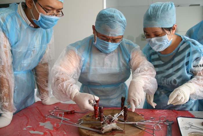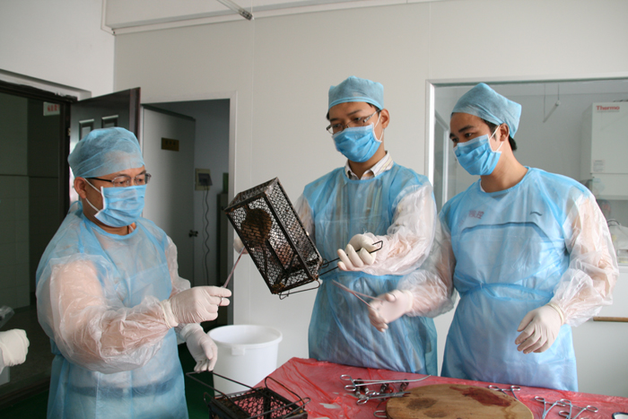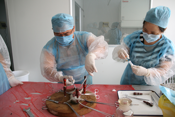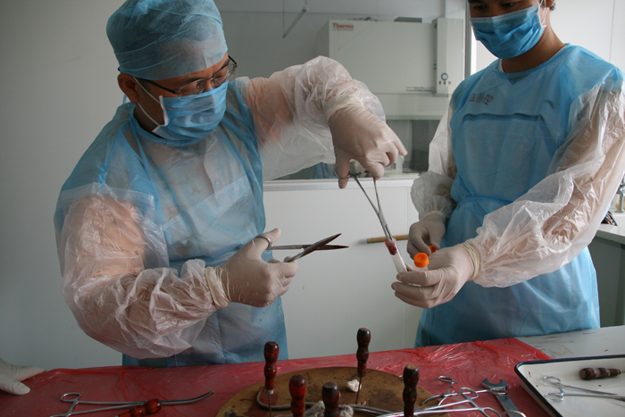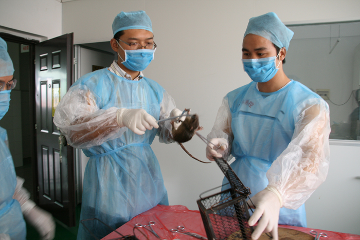 (肖善良副主任亲自上阵解剖老鼠) (从鼠笼移取老鼠