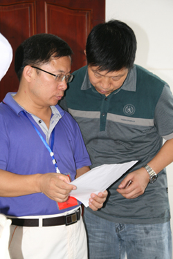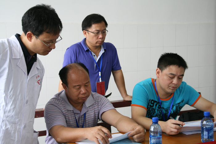 (卫生局刘晓江局长、肖增武副局长、李邦银委员来到演练现场指导和观摩) (县(市)参演单位及时到达演练现场) (考核组向参演队员告知演练流程) (检查应急物品准备情况) (检查采样设备装备情况) (演练队伍准备就绪进入模拟事件现场) (演习队员在开展流行病的调查) (现场提问解答) (对可疑污染进行采样) (考核人员进行评分) (市CDC肖善良副主任和县CDC同仁在交流) (市CDC肖善良副主任对疾病预防控制组演练情况进行点评)