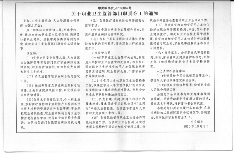 中编办关于职业卫生监管部门职责分工的通知