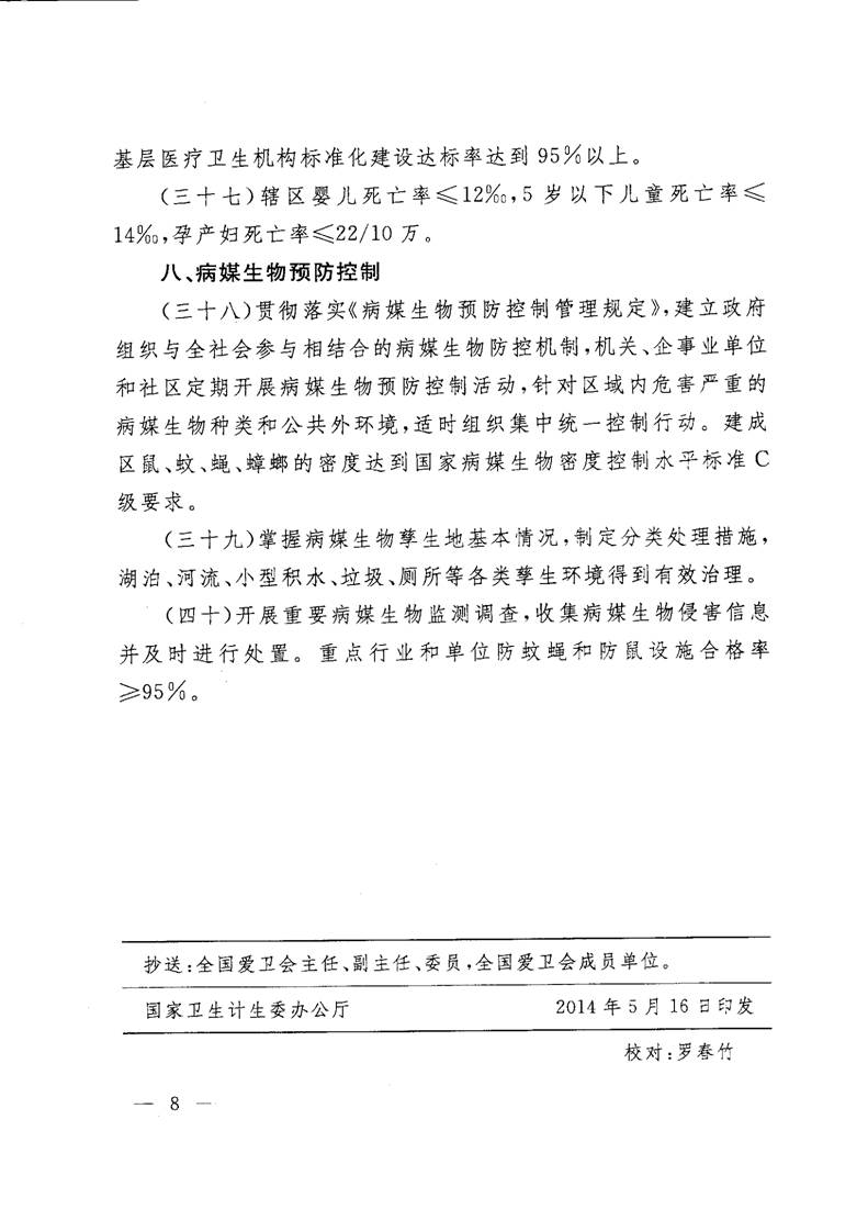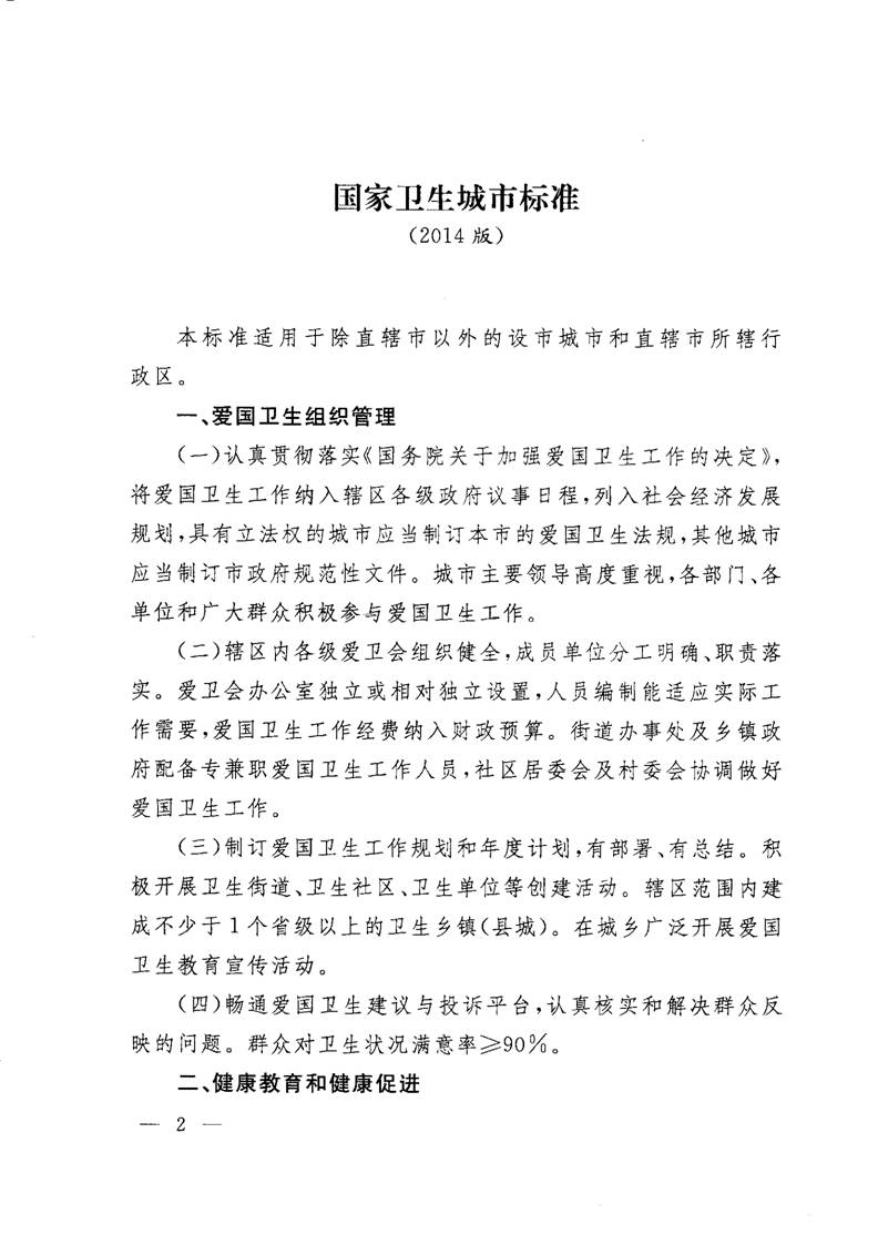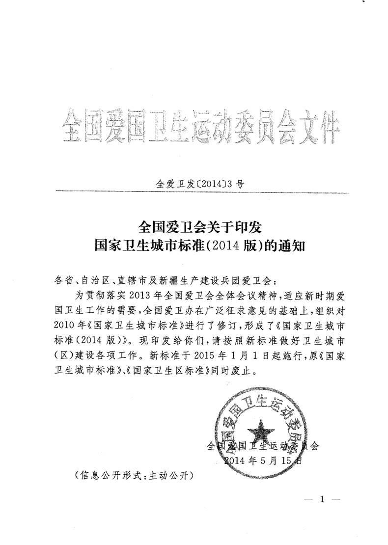 现将《全国爱卫会关于印发国家卫生城市标准(2014版)的通知》(全爱卫发〔2014〕3号)转发给你们,请各地按照新的国家卫生城市标准做好卫生城市创建和巩固提高工作。