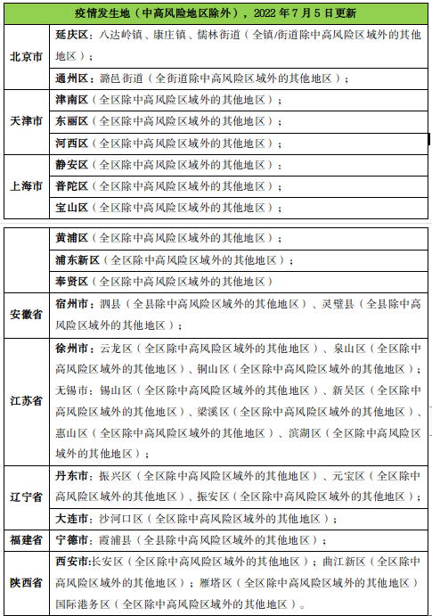3、疫情发生地(中高风险地区除外)返入邵人员:7天内有疫情发生地(中高风险地区除外)旅居史的人员3天内应完成2次核酸检测,并做好健康监测,2022年7月5日涉及县区如下: