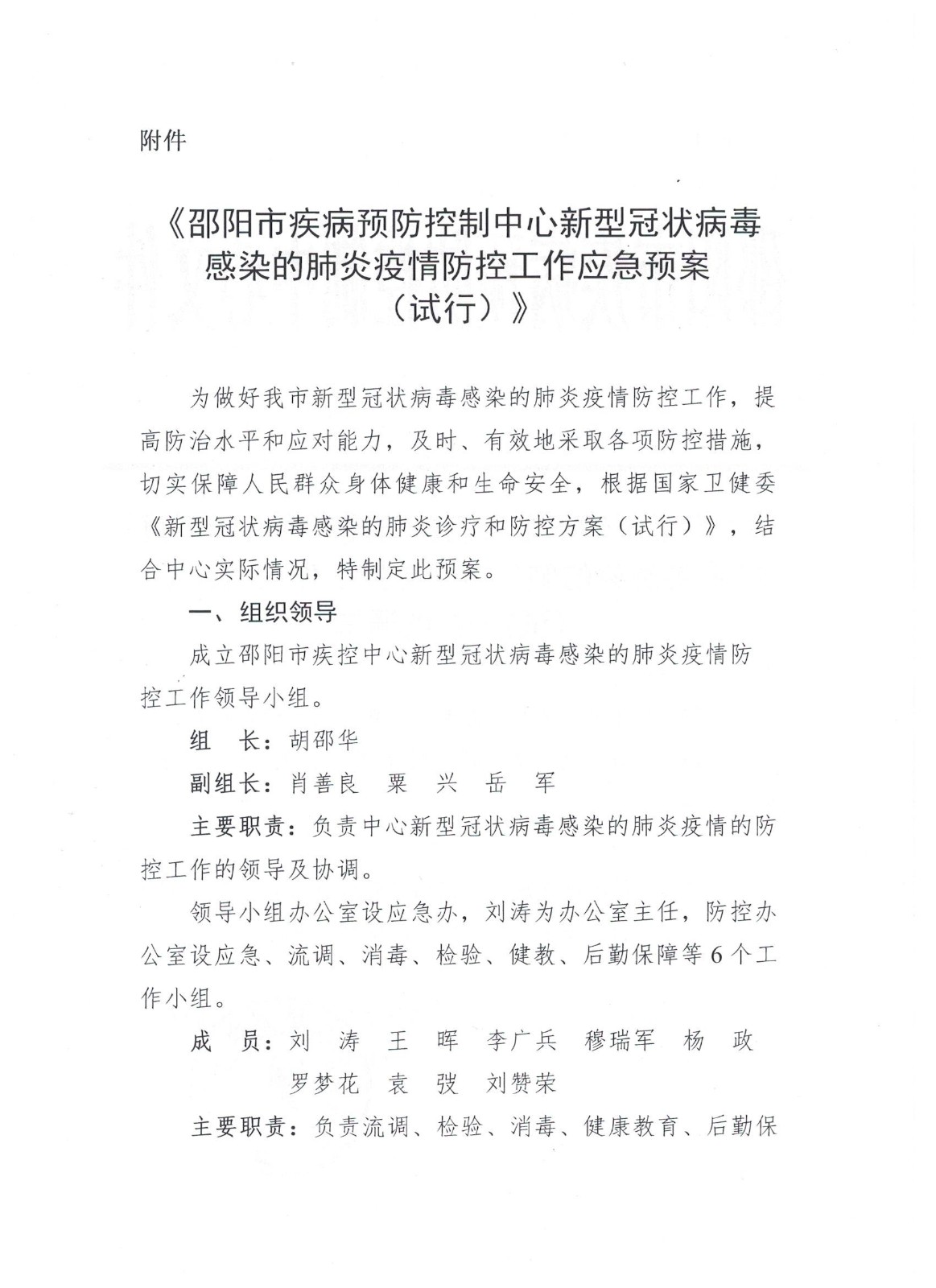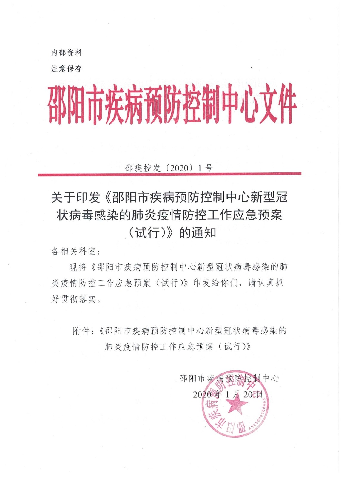 2.制定应急预案,成立防控领导小组。1月20日,组织制定《邵阳市疾病预防控制中心新型冠状病毒感染的肺炎疫情防控工作应急预案(试行)》的通知,并于当天启动;成立以中心党委书记、主任胡邵华为组长的领导小组,领导防控工作;下设应急、流病、微检、消毒、健教、后勤保障、督导检查等7个组,具体负责防控工作落实。