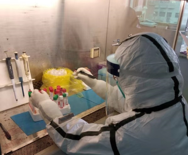 核酸检验有在生物安全柜中进行核酸提取、配制核酸检测反应体系等程序。每一步都需要非常谨慎的操作,才能够保障生物安全,避免实验室泄露与感染的事故发生。“防护服很厚,穿在身上我们常常大汗淋漓;护目镜上也总是由于哈了气,雾蒙蒙的……但是防护物资有限,我们在保证安全的前提下得尽量节省使用,那些一次性口罩、防护服,从穿戴好到脱下来可能要坚持四五个小时。”赵军嵘介绍道。她表示,最开心的时刻是做出来的一批实验结果都是阴性,没有人患病的那一刻,这就是最大安慰。