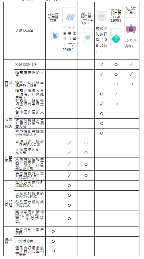 在新型冠状病毒感染的肺炎流行期间,建议选择合适的口罩类型,不过度防护。按防疫工作性质和风险等级提出以下指引: