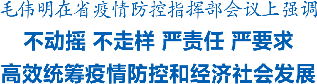 省委副书记、省长、省疫情防控指挥部总指挥长毛伟明主持召开省疫情防控指挥部会议,他强调,要深入贯彻习近平总书记关于疫情防控的重要论述,坚决贯彻党中央、国务院决策部署,精准落实优化防控工作“二十条措施”,不动摇、不走样,严责任、严要求,坚决打赢重点地区歼灭战和常态化疫情防控攻坚战,高效统筹疫情防控和经济社会发展。