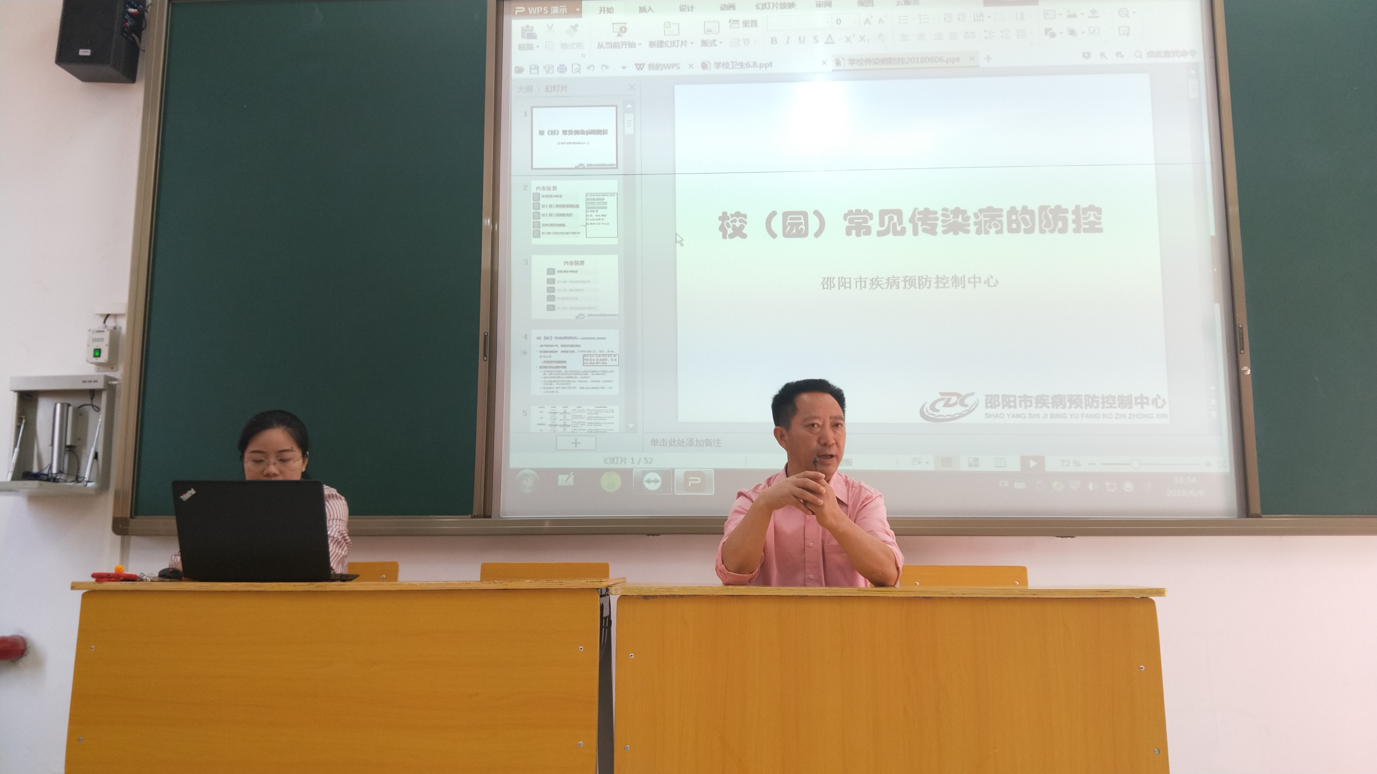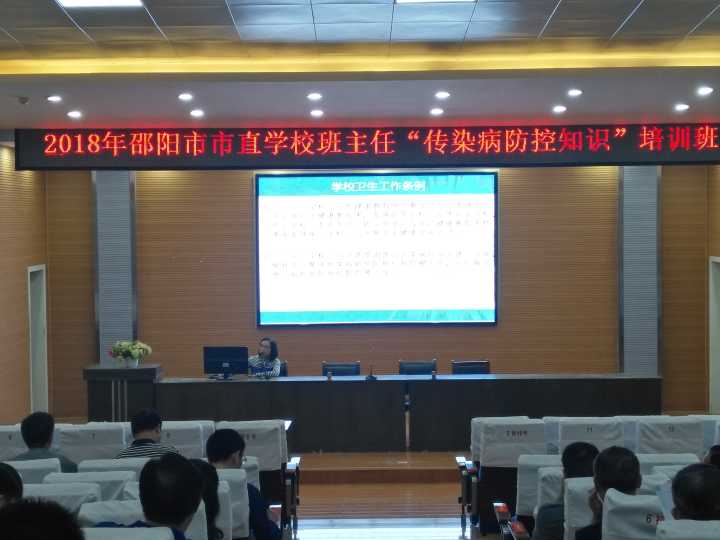2018年5月30日-6月6日,由市教育局、市卫计委组织,市疾控中心承办的邵阳市市直学校班主任“传染病防控知识”培训班,依次在邵阳市一中、邵阳市六中、资江学校、湘郡铭志、邵阳市二中、湘中幼儿师范高等专科学校等巡回举行,共有1000余人参加培训。
